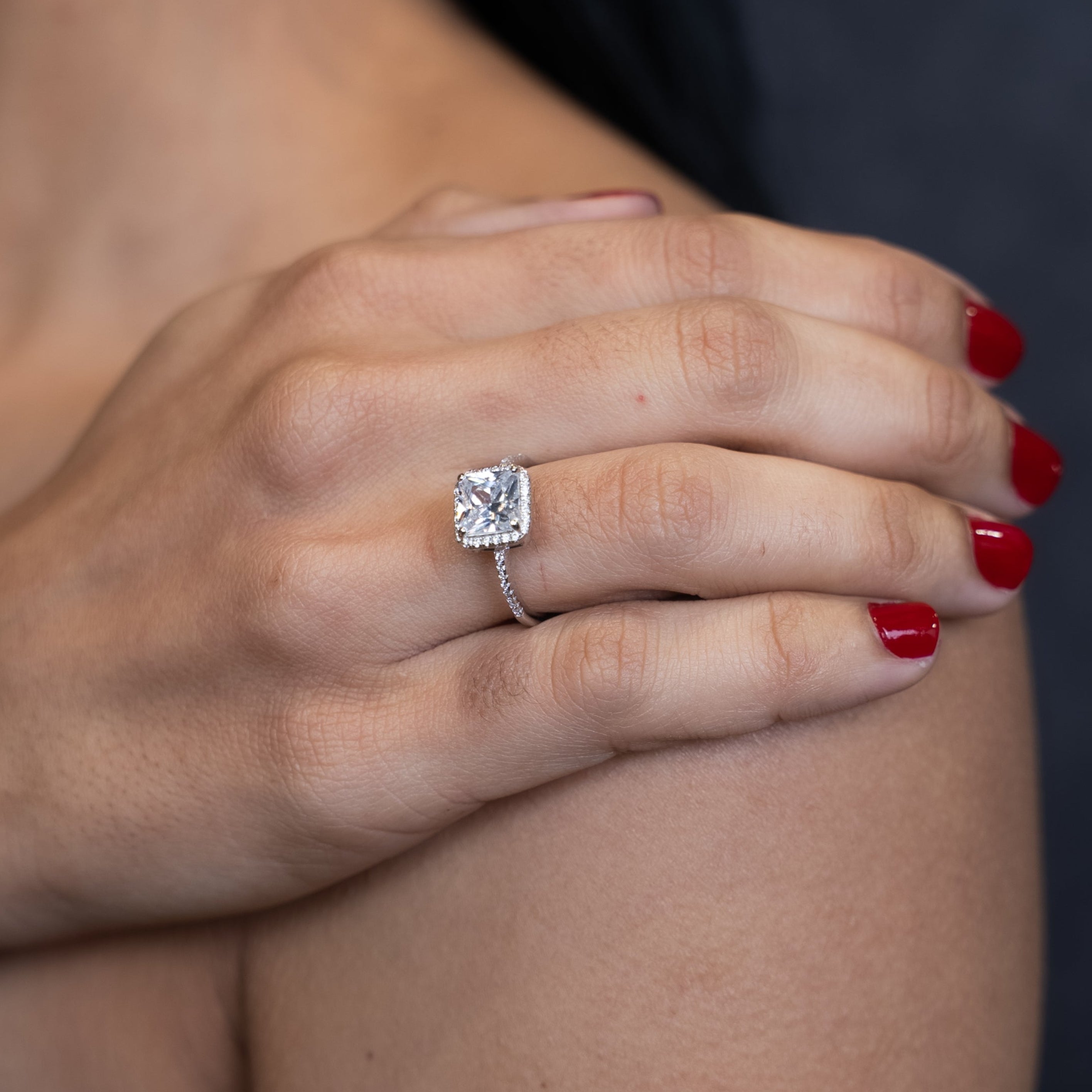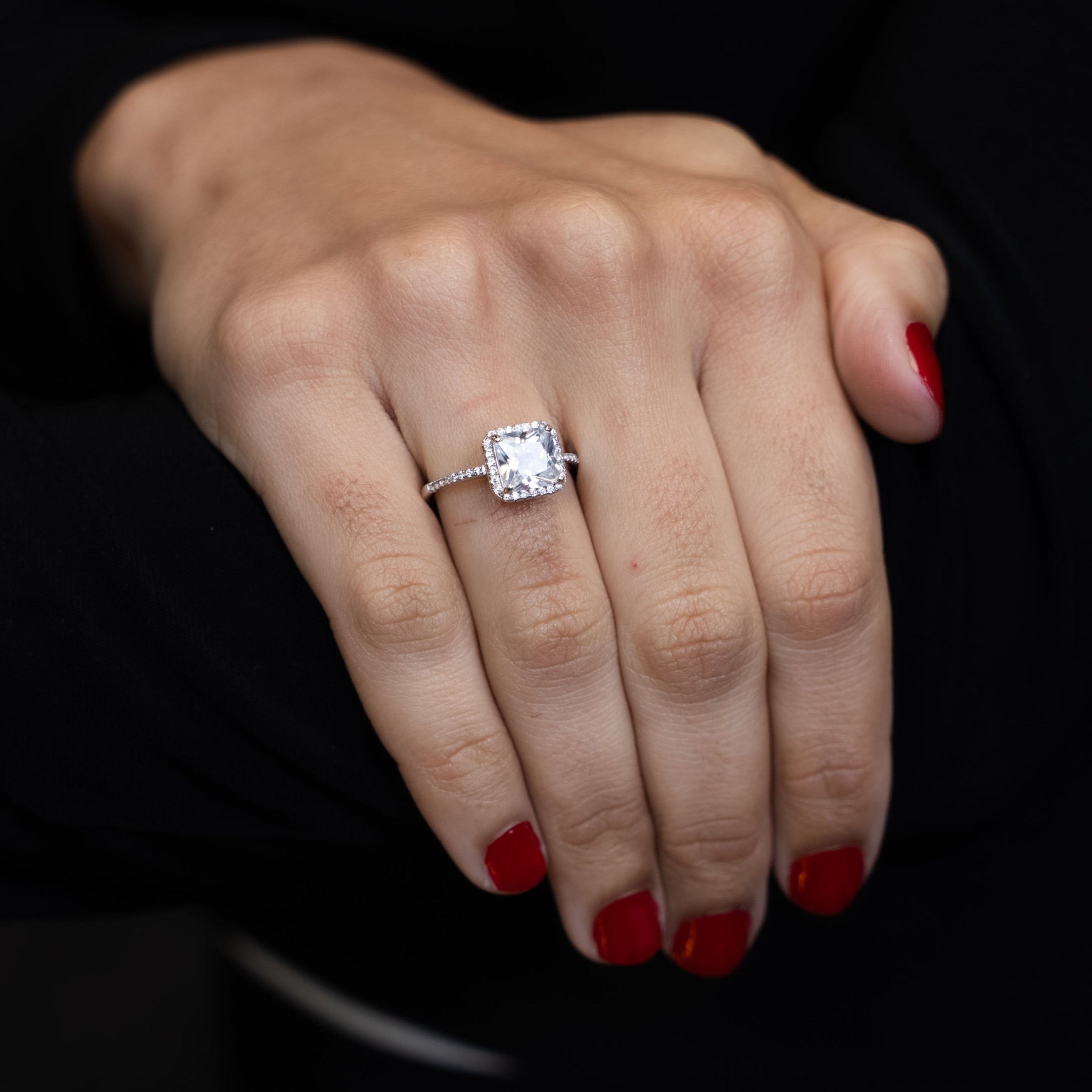 Celebrate your love with a ring that radiates confidence and clarity. This exquisite design features a bold square‑cut center CZ stone—crisp, luminous, and beautifully structured. Surrounding it, a constellation of round CZ accents adds soft brilliance, creating a perfect balance of sharp geometry and delicate sparkle.
