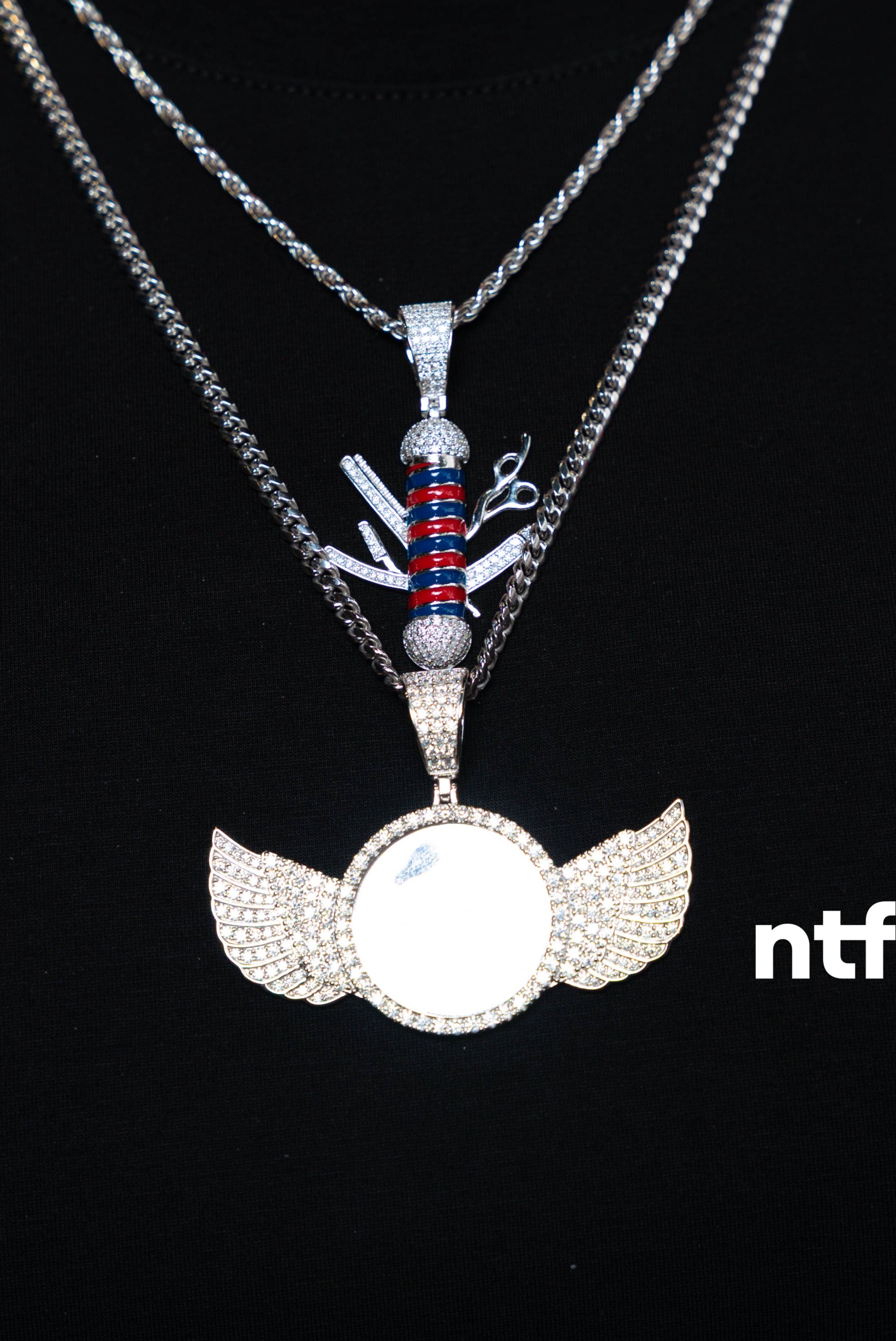 Elevate your look with this curated chain set, designed to turn heads. The 26” Cuban link chain (3.5 mm width) features a striking “Pic” pendant with wings, exuding power and personality, while the 22” rope chain (2.5 mm width) is finished with a fully moissanite barber pendant for intense, diamond-like brilliance.